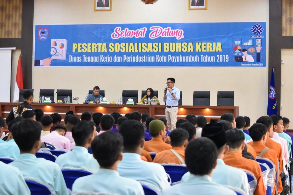 Payakumbuh, SUARAPRIBUMI — Demi terus menekan angka pengangguran di Kota Payakumbuh, Dinas Tenaga Kerja dan Perindustrian (Disnakerperin) Kota Payakumbuh Sosialisasikan Bursa Kerja Kepada Ratusan Pelajar SMA sederajat yang ada di Kota Randang, di Aula Ngalau Indah Lt.III Balai Kota Payakumbuh, Jumat (22/11).