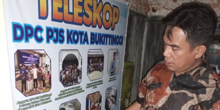 Bukan tumpukan berkas atau rilis berita yang memikatnya, melainkan deretan bingkai visual unik yang dikonsep menyerupai teleskop. Bingkai-bingkai tersebut merangkum perjalanan dan rekam jejak kegiatan PJS Bukittinggi dalam balutan estetika yang tak biasa bagi sebuah kantor organisasi pers.