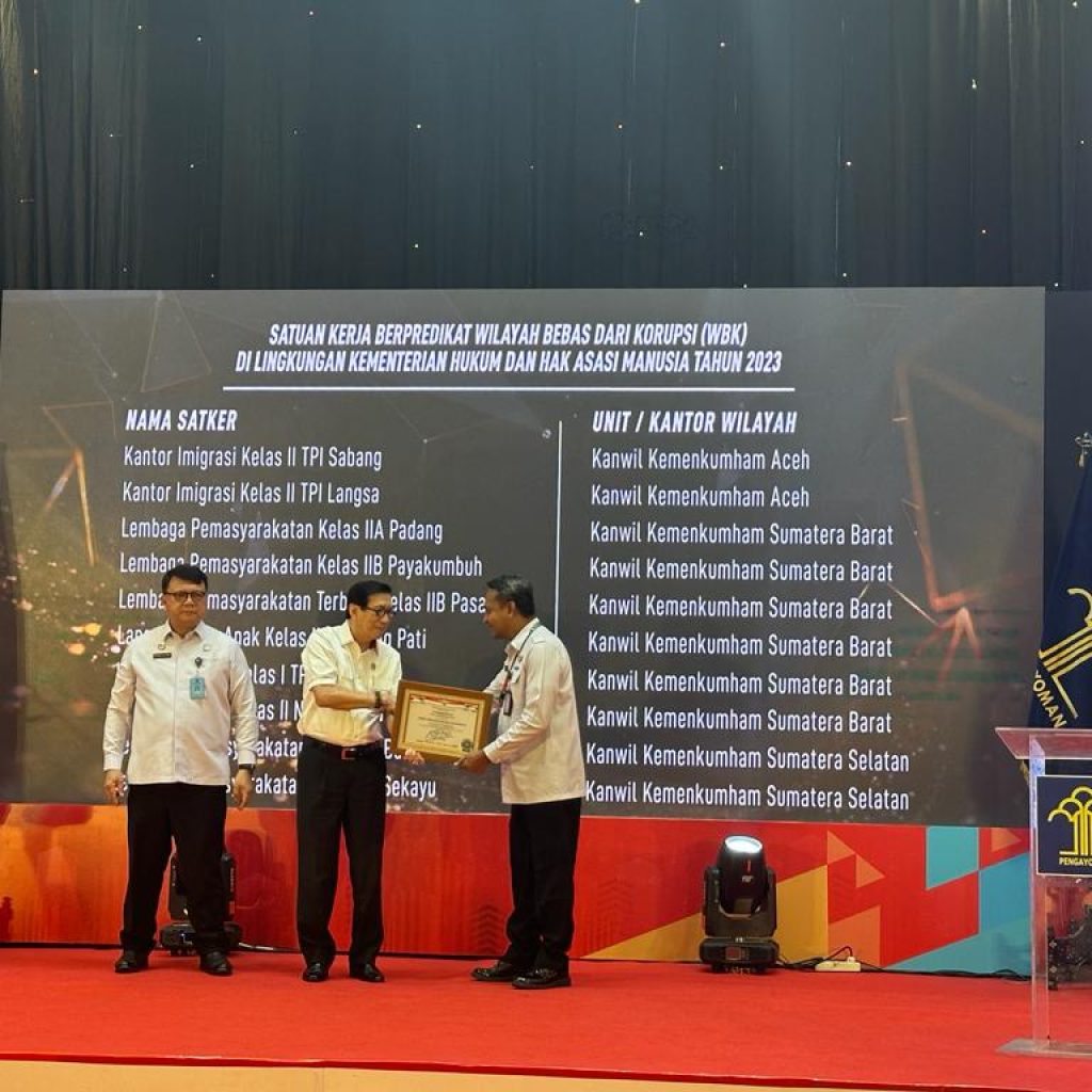 Sedangkan dalam lingkup Kantor Wilayah Kemenkumham Sumbar, 6 satuan kerja yang mendapat predikat WBK diantaranya Lapas Kelas IIB Tanjung Pati (Ex. Lapas Payakumbuh) , Kanim Agam, Kanim Padang, dan Lapas Kelas IIA Padang, Lapas Terbuka Pasaman dan LPKA Tanjung Pati
