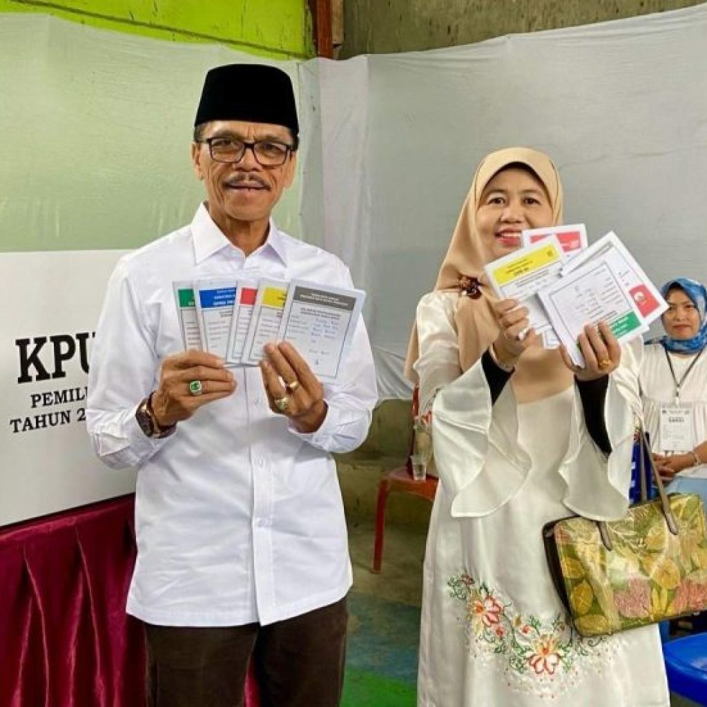Limapuluh Kota, suarapribumi.co.id — Bupati Lima Puluh Kota Safaruddin Dt. Bandaro Rajo menggunakan hak pilihnya di tempat pemungutan suara (TPS) 08 Nagari Baruah Gunuang, Rabu, (14/02/24). Meski diguyur hujan, Bupati Safaruddin bersama keluarga tampak kompak memakai baju putih melaksanakan pencoblosan pada pukul 09.00 WIB.