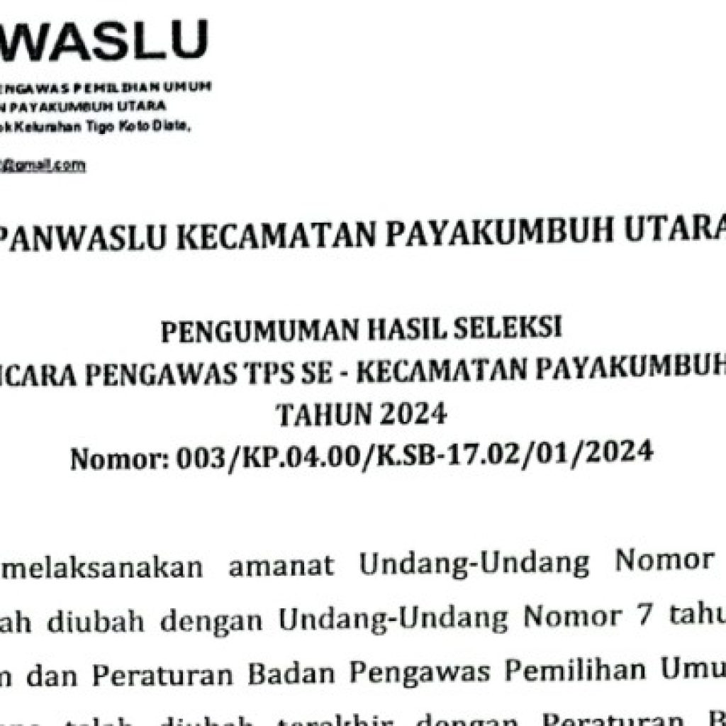 Setelah melakukan pemeriksaan kelengkapan, keabsahan, legalitas berkas persyaratan dan telah menilai hasil wawancara calon Pengawas TPS Se-Kecamatan Payakumbuh Utara bersama ini kami Panitia Pengawas Pemilu Kecamatan Payakumbuh Utara mengumumkan nama-nama Calon Pengawas TPS yang Lulus tahap seleksi wawancara sebagai berikut: