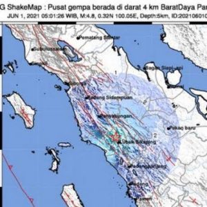 Suarapribumi, Pasaman– Gempa kembali menggemparkan di Pasaman, pada Sabtu (12 juni 2021) pukul 04.37 WIB. Berdasarkan Hasil analisis BMKG menunjukkan bahwa gempa bumi ini memiliki parameter dengan magnitudo M=4.9. Episenter gempabumi terletak pada koordinat 0.05 LS dan 100.03 BT.