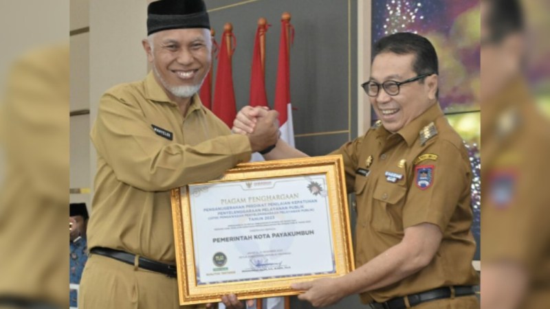 Penghargaan bergengsi dibidang pelayanan publik tersebut diserahkan langsung oleh Gubernur Sumbar Mahyeldi Ansarullah yang didampingi Kepala Ombudsman RI Perwakilan Sumbar Yefri Heriani kepada Penjabat (Pj) Wali Kota Payakumbuh Jasman.