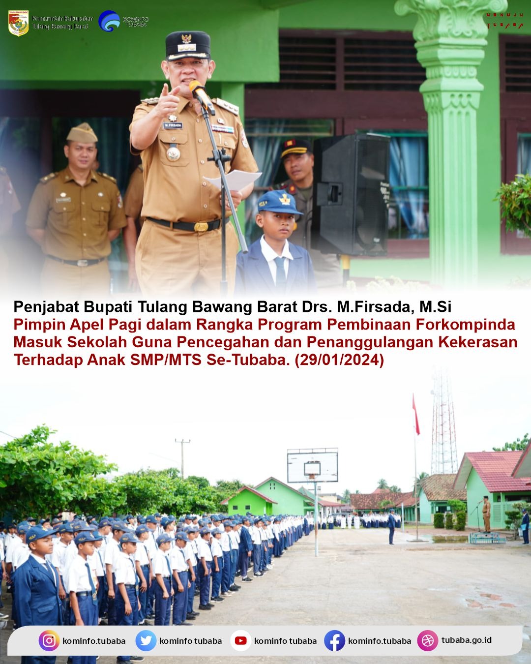 Diskominfo Tubaba – Suara Pribumi Co.id Penjabat (Pj) Bupati Tulangbawang Barat (Tubaba) Drs. M.Firsada, M.Si Pimpin Apel Pagi dalam rangka Program Pembinaan Forkompinda Masuk Sekolah Guna Pencegahan dan Penanggulangan Kekerasan Terhadap Anak SMP/MTS Se-Tubaba,