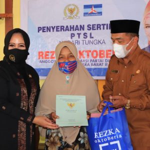 Limapuluh Kota, Suarapribumi.co.id — Anggota DPR RI dari Fraksi Demokrat Rezka Oktoberia menyerahkan sertifikat Pendaftaran Tanah Sistematis Lengkap (PTSL) di Nagari Situjuah Tungkar, Kecamatan Situjuah Limo Nagari, Kabupaten Limapuluh Kota secara simbolis di balai adat nagari setempat, Senin (2/8).