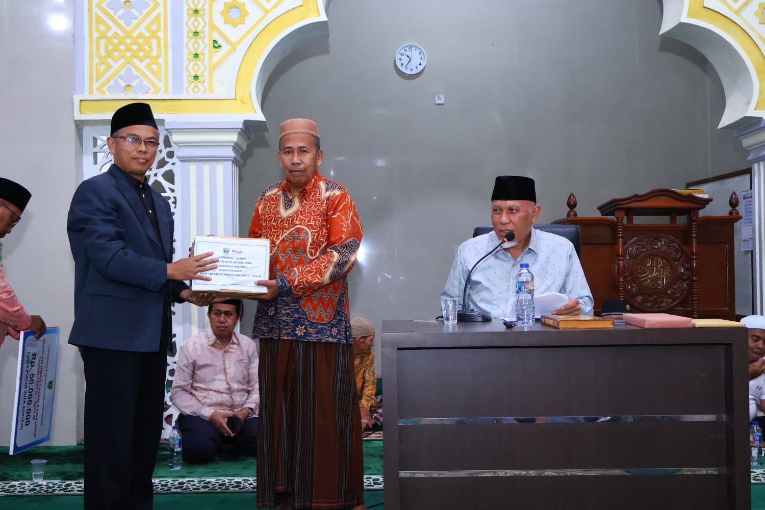Dalam kunjungan tersebut, Tim Safari Ramadan Provinsi Sumatera Barat yang dipimpin Gubernur Mahyeldi Ansharullah menyalurkan bantuan untuk Masjid Arruhama dengan total Rp74,5 juta.