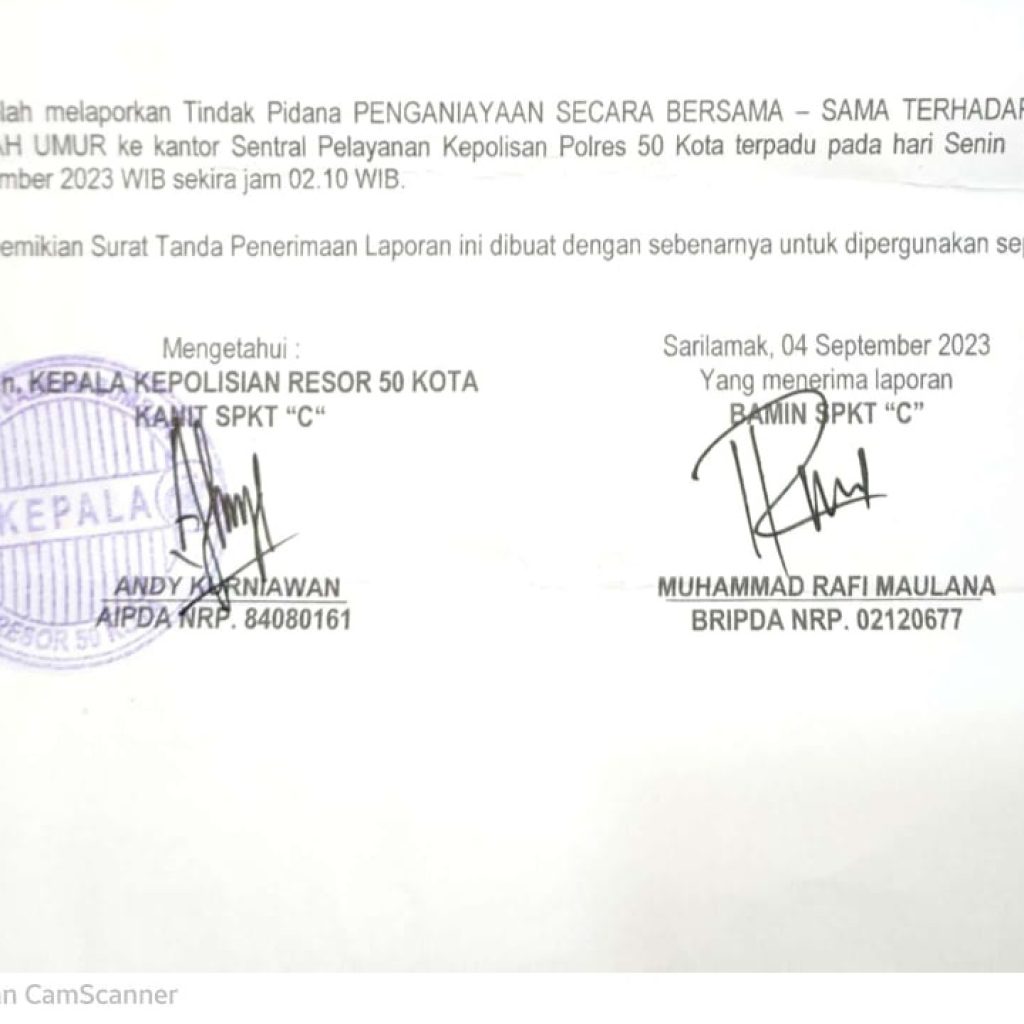 Tercatat surat terima laporan polisi bernomor LP/B/98/….. yang ditanda tangani Kanit SPKT Resor Polres 50 Kota.
